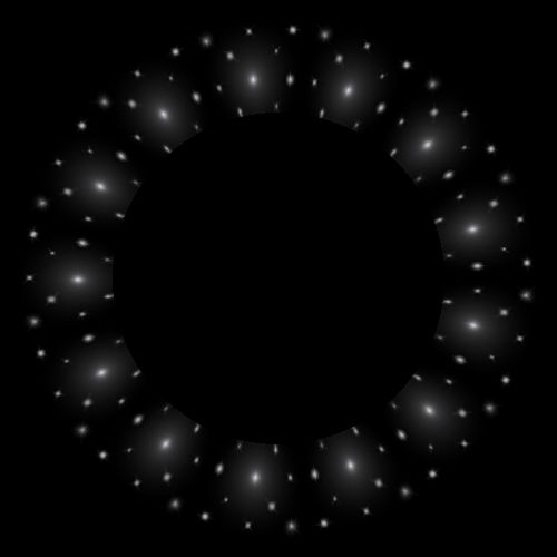 White stars with black background. One star has a halo.